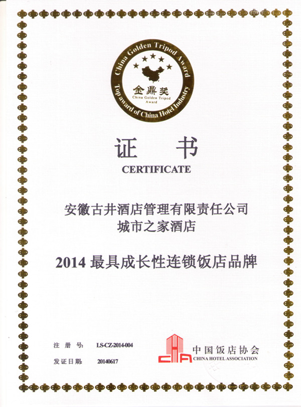 6月16日,,,,,,,由中国饭店协会、上海盈蝶旅馆管理咨询有限公司主理的2014中国饭店工业大会——第二届中国连锁饭店生长论坛暨连锁饭店品牌排行榜宣布会在上海召开。。。。。。。。时代举行了盛大的金鼎奖颁奖仪式。。。。。。。。公司旗下都会之家品牌依附其快速的生长态势及优异的市场生长潜力荣获了“2014最具生长性连锁饭店品牌”大奖。。。。。。。。