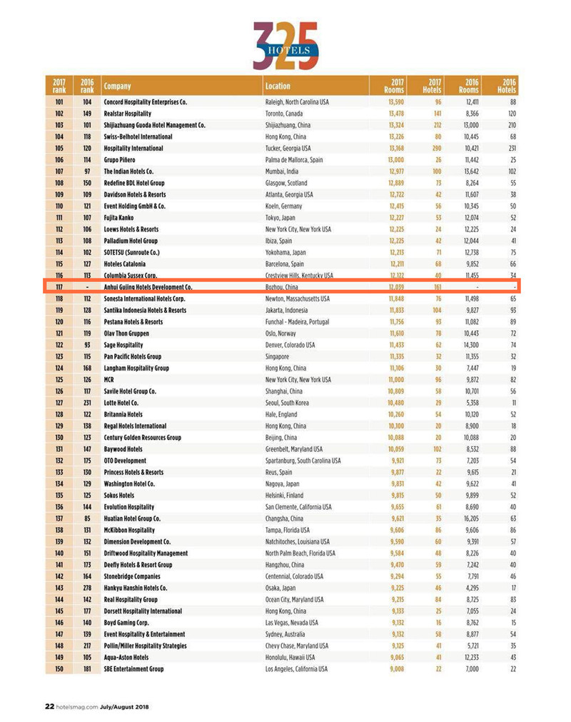 《HOTELS》是国际旅馆与餐厅协会会刊,,,,,已一连48年在全球170多个国家刊行,,,,,是全球旅馆业最关注的杂志之一。。。。。。《HOTELS》325全球排行榜以旅馆集团的旅馆和客房数目为排行依据,,,,,通过在线视察的方法举行,,,,,未提交资料的旅馆集团依据果真资料、历史提交信息、行业资源以及自力研究也加入排名。。。。。。年度全球旅馆集团300强排名,,,,,是《HOTELS》杂志最为人所知,,,,,也是业内最权威的旅馆集团排名系统。。。。。。